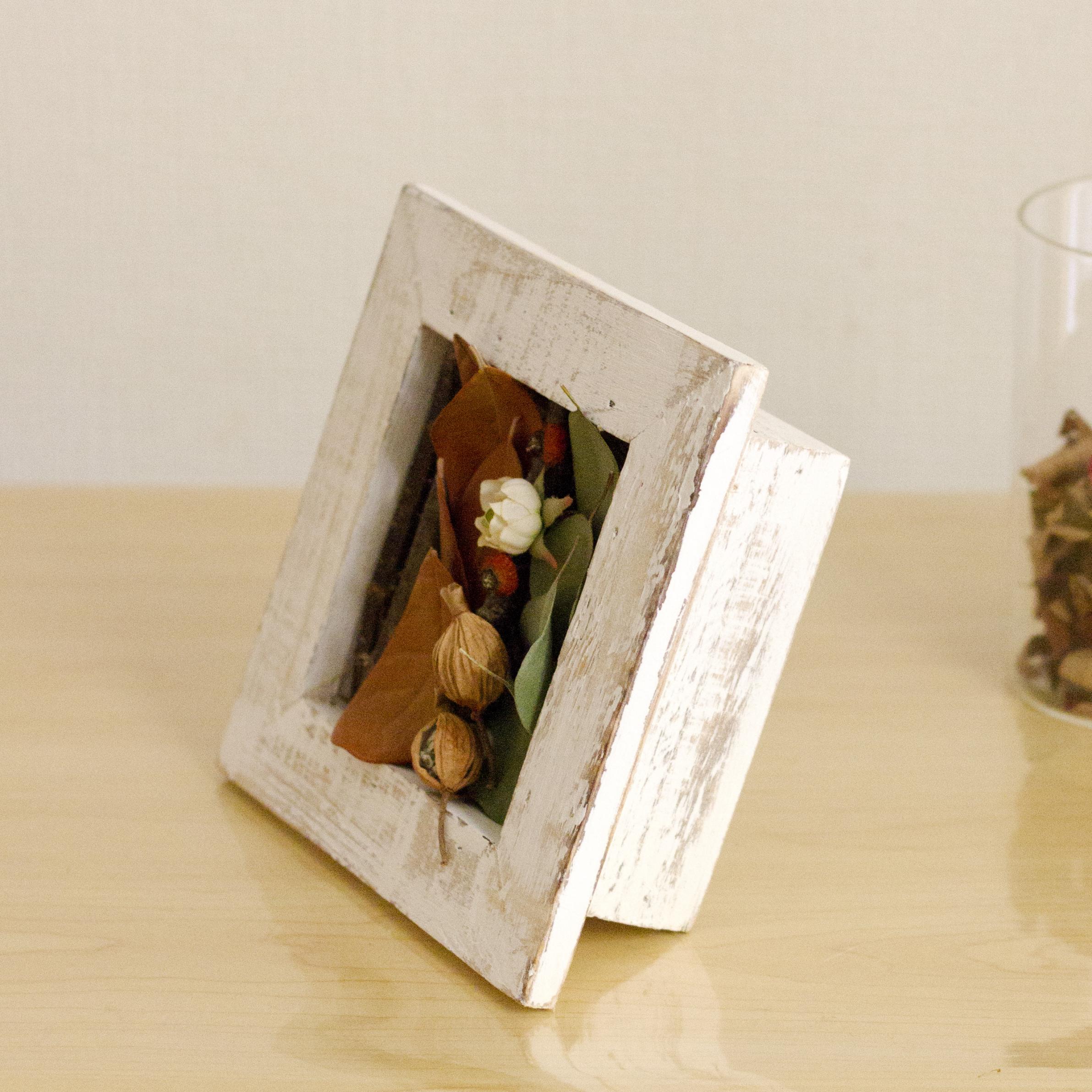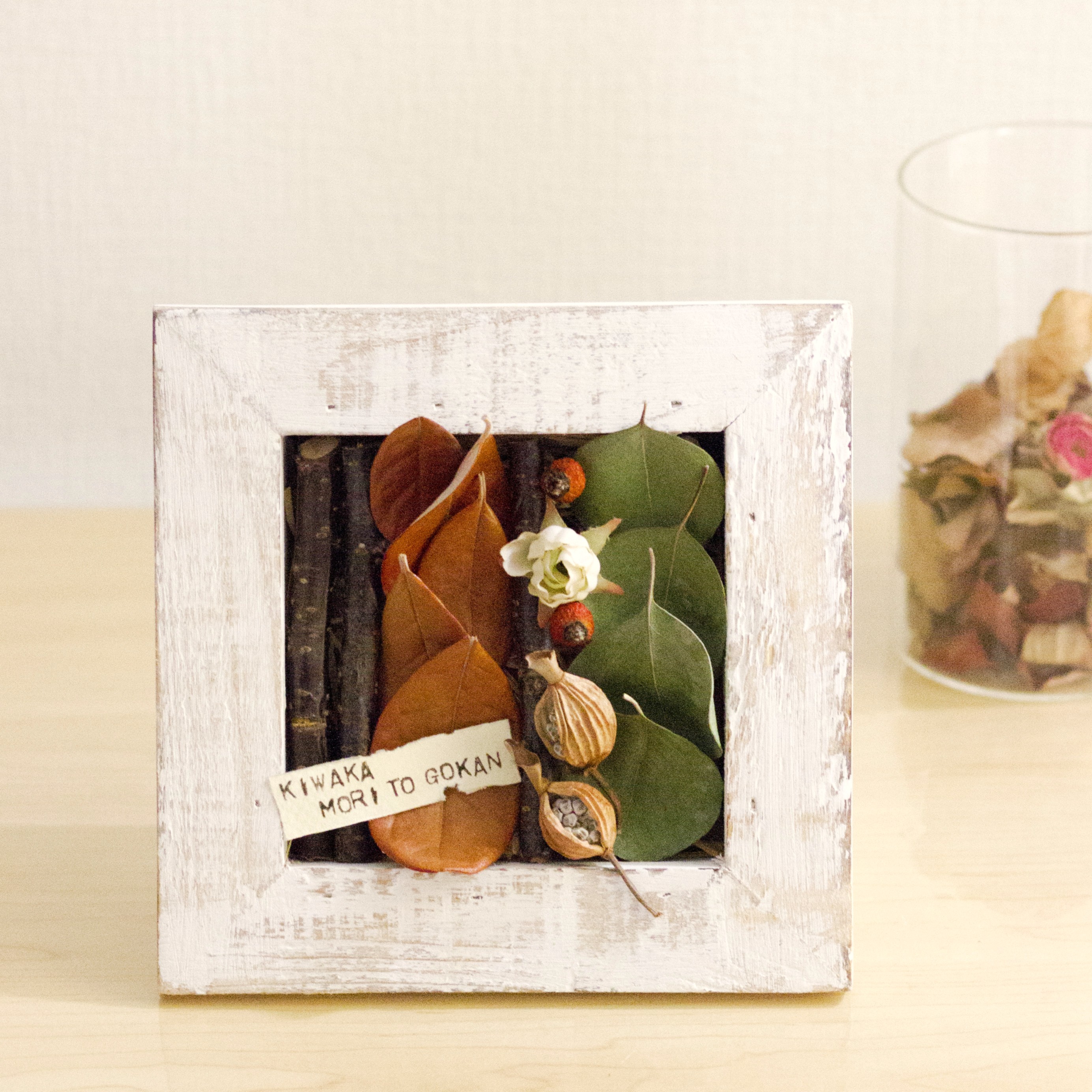 森の記憶を、額に閉じ込める。 教室には、レッスンで使った植物たちを丁寧にドライにした素材がたくさんあります。落ち葉、木の枝、小さな実、種の殻……どれも本物の自然が持つ、やさしい色と形。 その素材を手に取りながら、自分だけの「森の一景」を額の中に作っていただきます。 さらに、クラフト紙を手でちぎり、水で端をほぐして作るオリジナルタグに、アンティークのアルファベットスタンプを押す工程も体験していただけます。50年以上前のスタンプが、作品にそっと物語を添えてくれます。 |